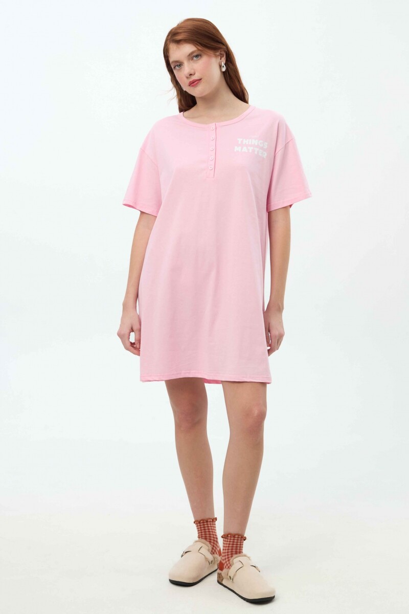 Con mangas cortas y un escote redondo abotonado, su diseño largo a la rodilla ofrece comodidad y estilo.